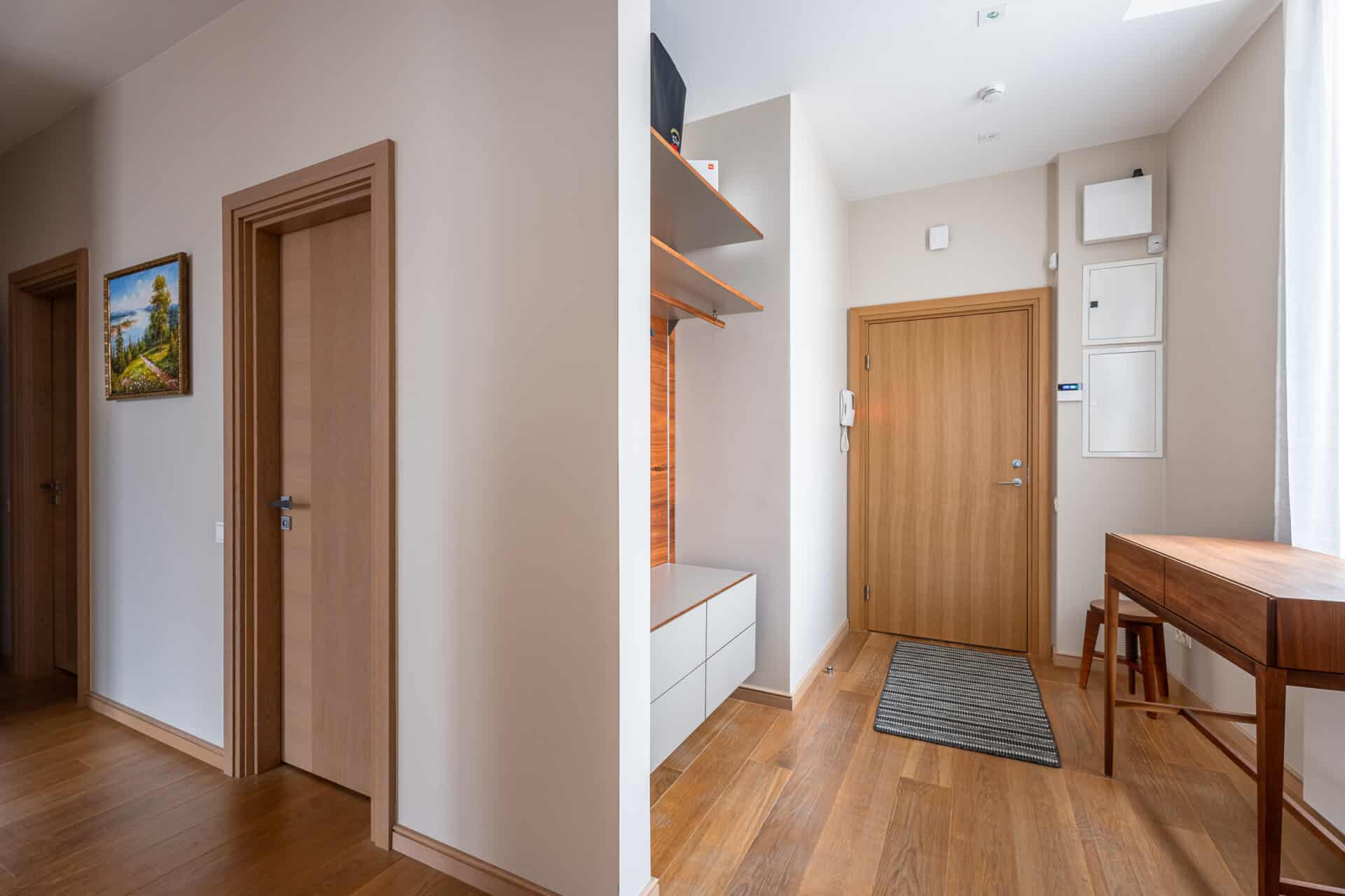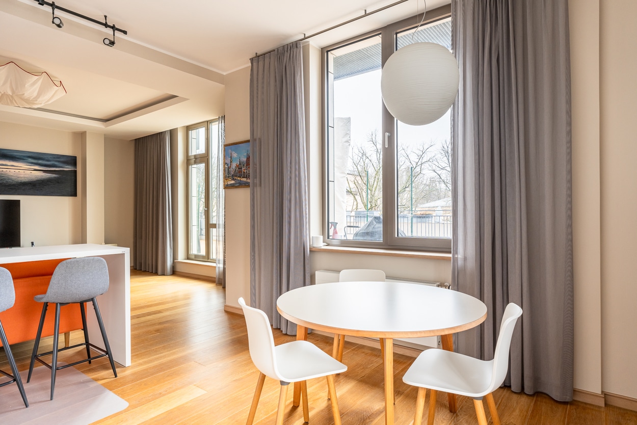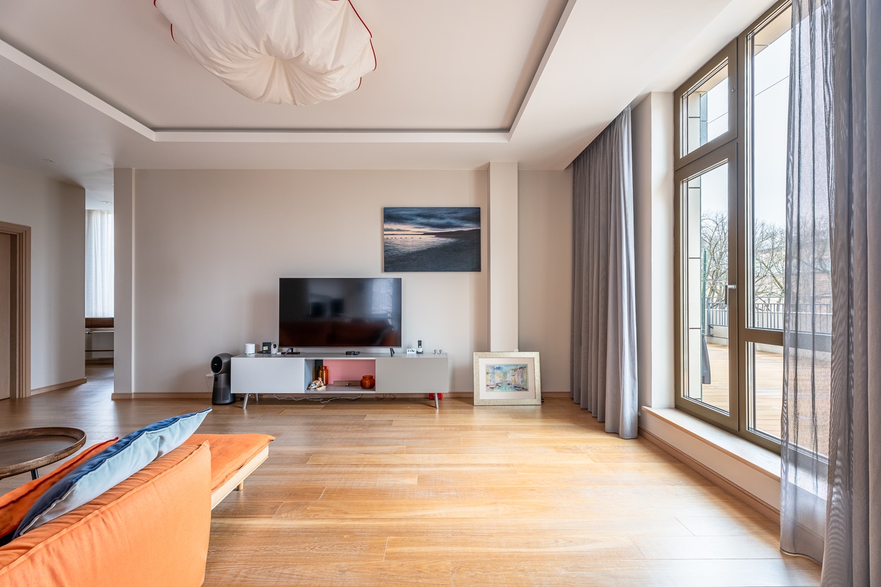 All rooms are kept in a minimal style – their decoration, which consists of high-quality materials selected in neutral tones, harmoniously interacts with high 3m ceilings and the spacious living environment. The apartment is equipped with interior solutions created by the designer and suitable tasteful furniture, the purchase of which can be negotiated with the owner of the apartment.