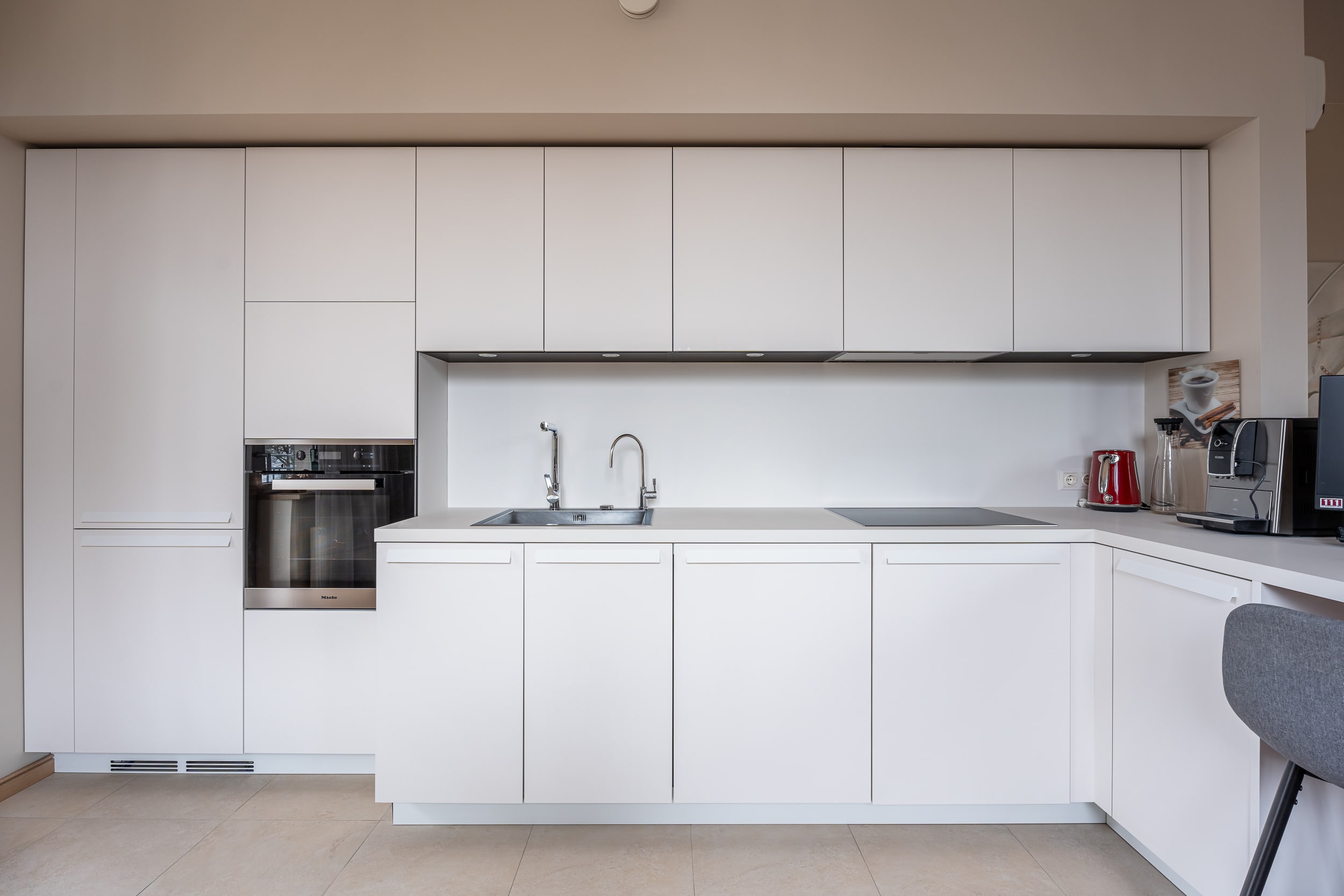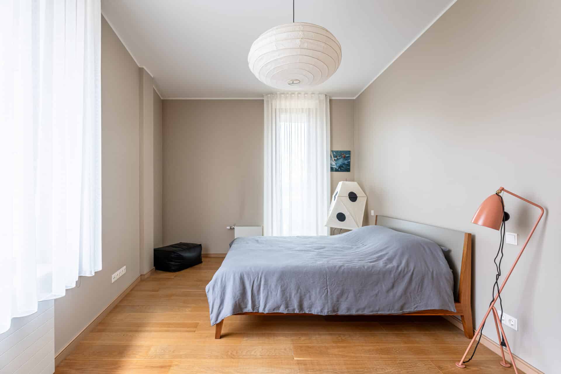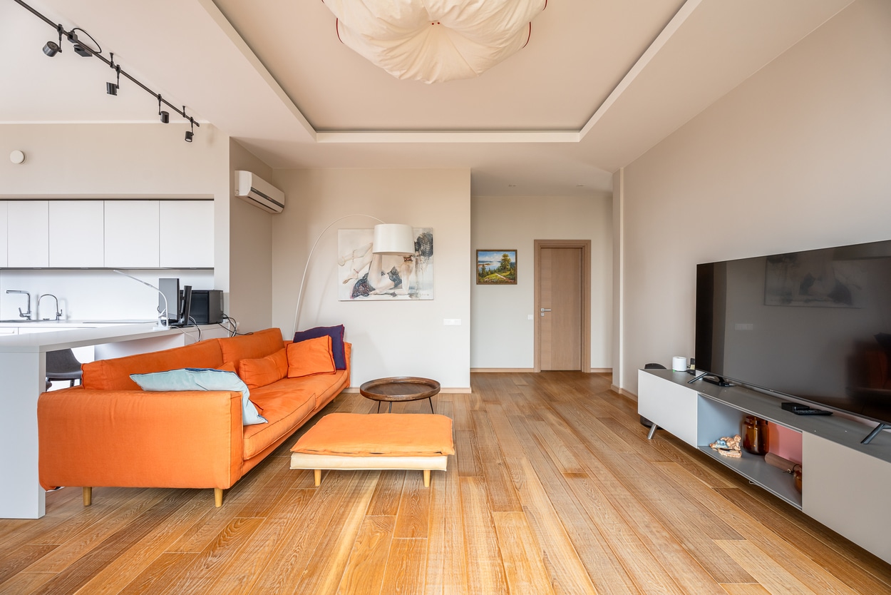 All rooms are kept in a minimal style – their decoration, which consists of high-quality materials selected in neutral tones, harmoniously interacts with high 3m ceilings and the spacious living environment. The apartment is equipped with interior solutions created by the designer and suitable tasteful furniture, the purchase of which can be negotiated with the owner of the apartment.