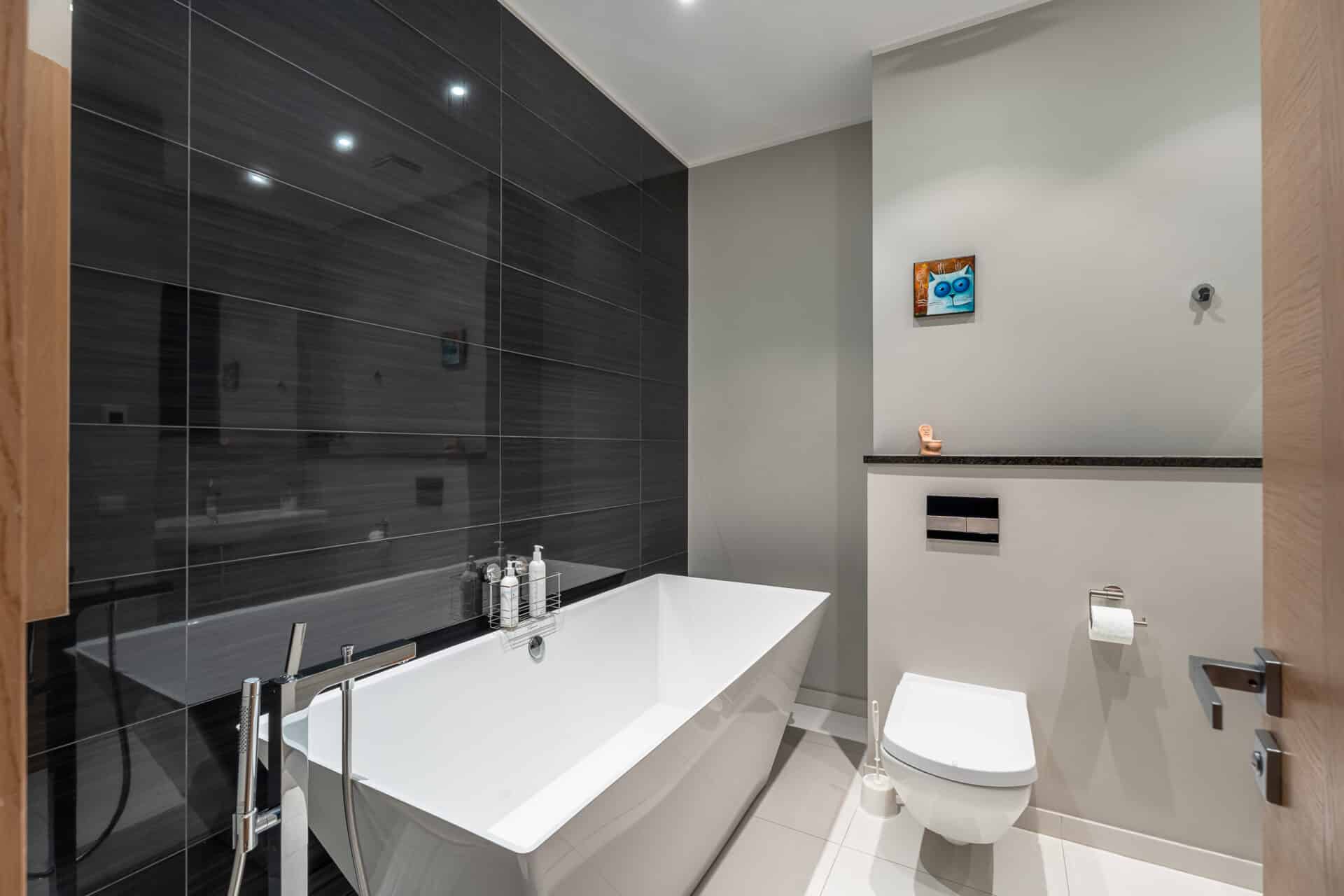 The 174 square meter apartment (useful area – 107 square meters) offers the enjoyment of a comfortable and modern way of life. Entering the apartment, you find yourself in a bright corridor with a window and a built-in wardrobe, immediately opposite is the first 19 sqm bedroom, from the corridor there is an entrance to a spacious living room 57 sqm. with a dining area and a kitchen, with an exit to both terraces. In the far corner of the apartment is the owner’s 22 sq.m. bedroom with 2 bathrooms with bath and shower next to it..