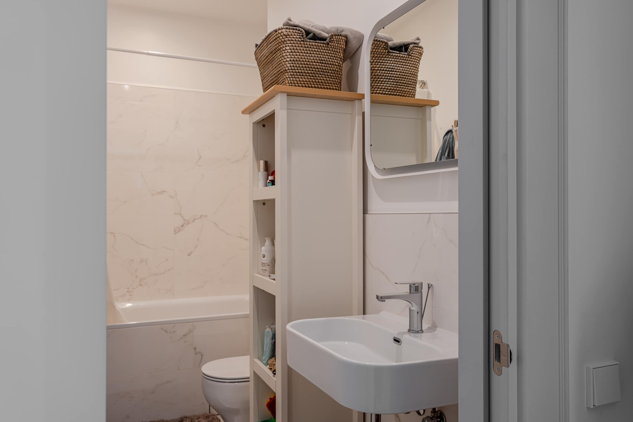 The spacious 3-room apartment consists of an entrance hall, a bathroom with a bathtub, a living room combined with a kitchen area, and 2 bedrooms.