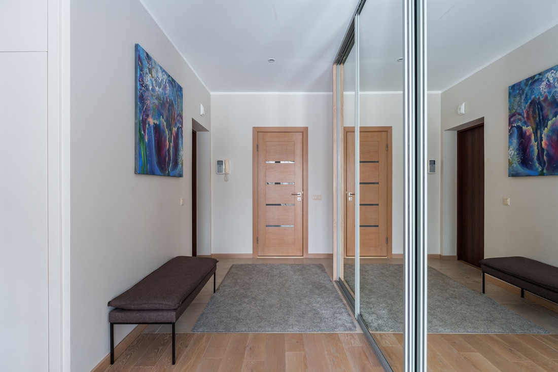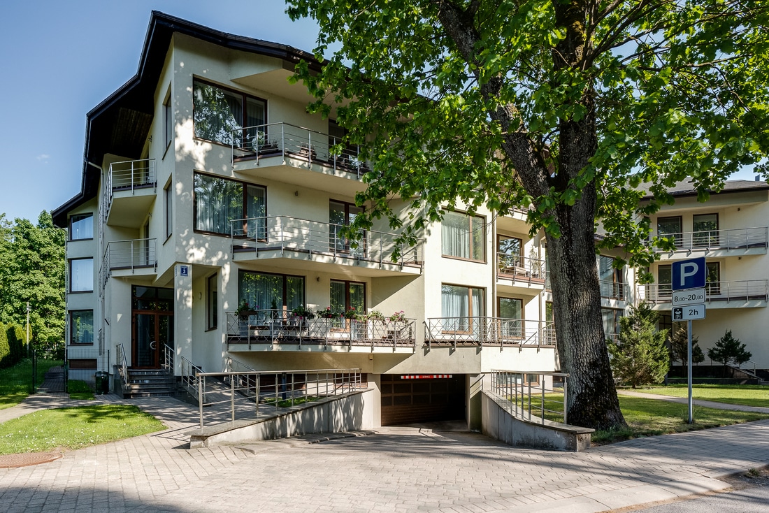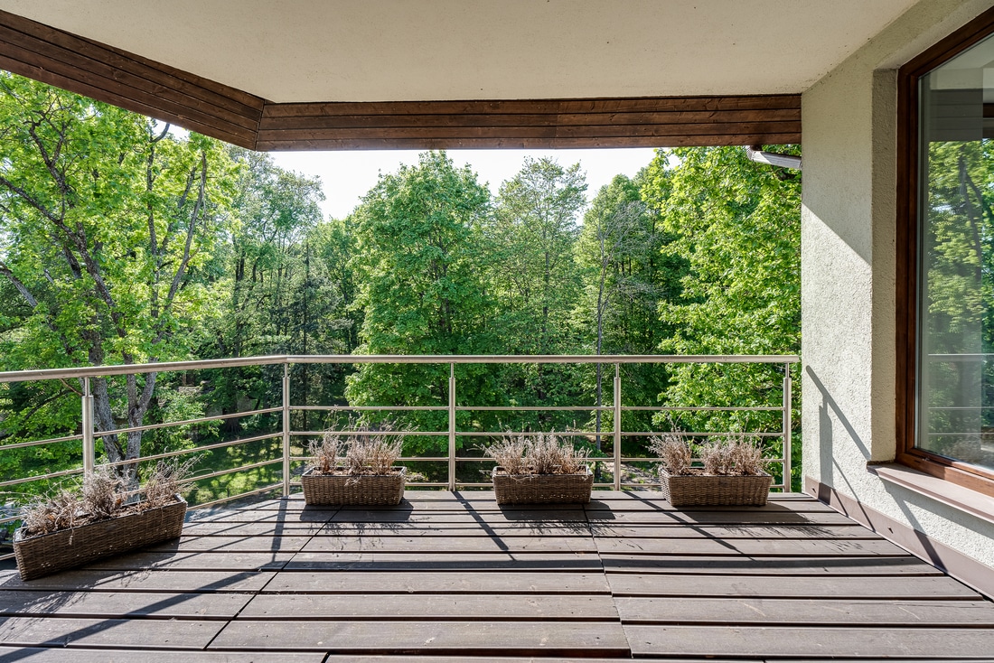 A bright and thoughtfully designed two-level apartment with a terrace, two balconies, and the feeling of a private house is available for sale in a gated, green area of the Berģi district in Riga.