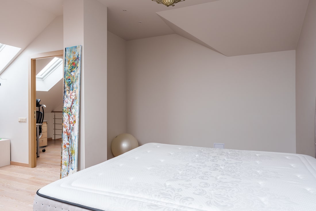 On the 2nd level (4th floor / attic), there is a spacious bedroom, a work or relaxation area, and a large bathroom with a bathtub and shower.