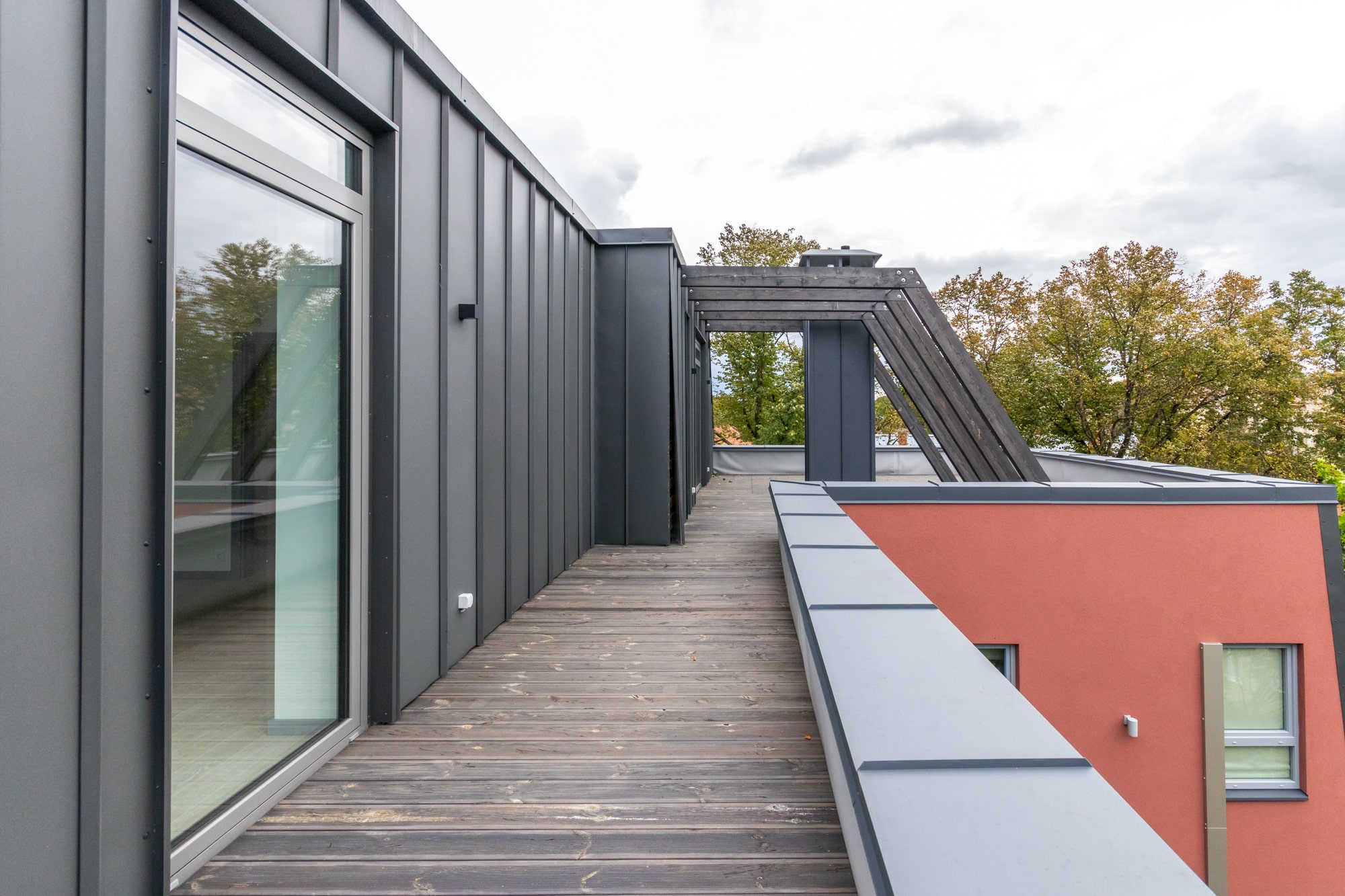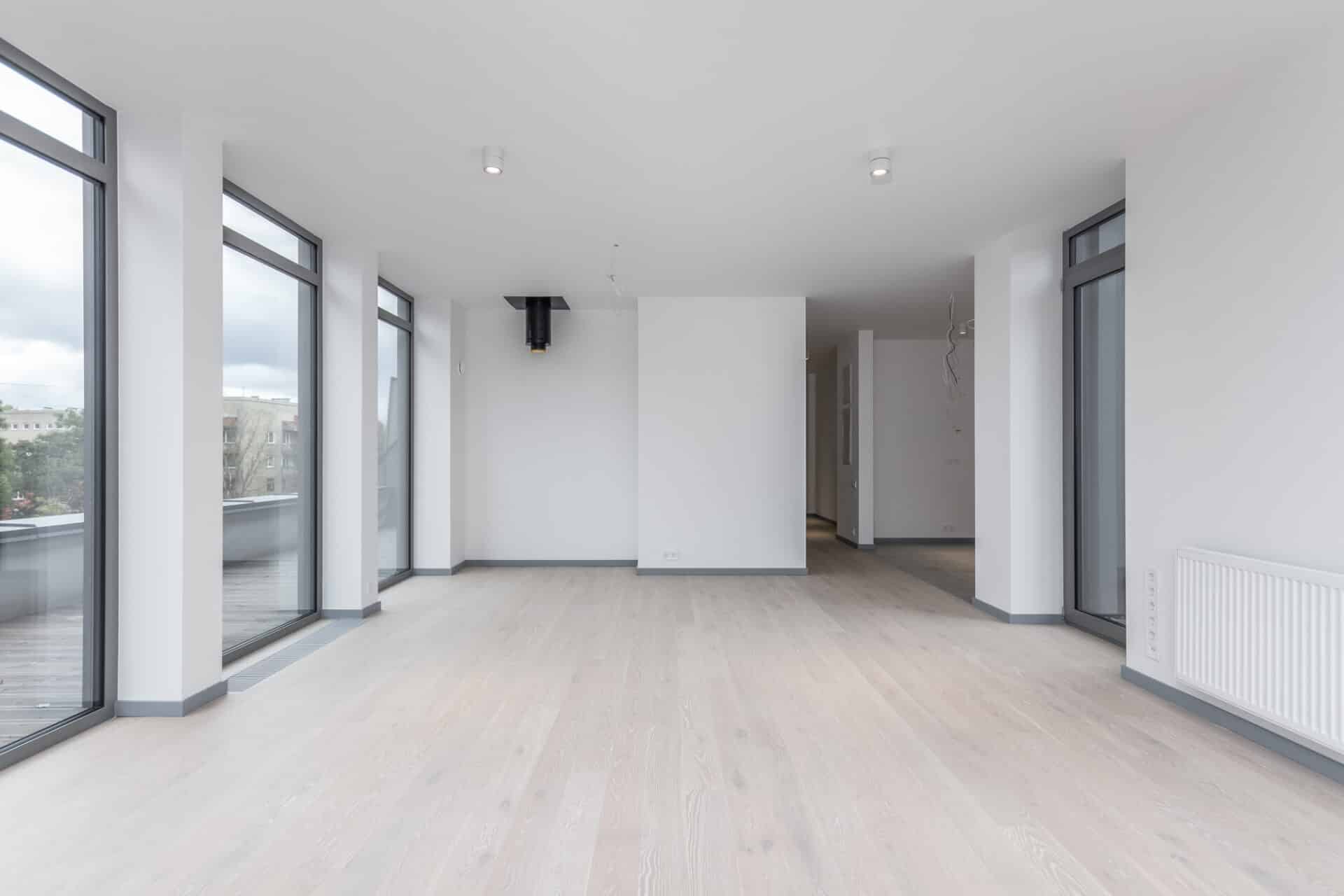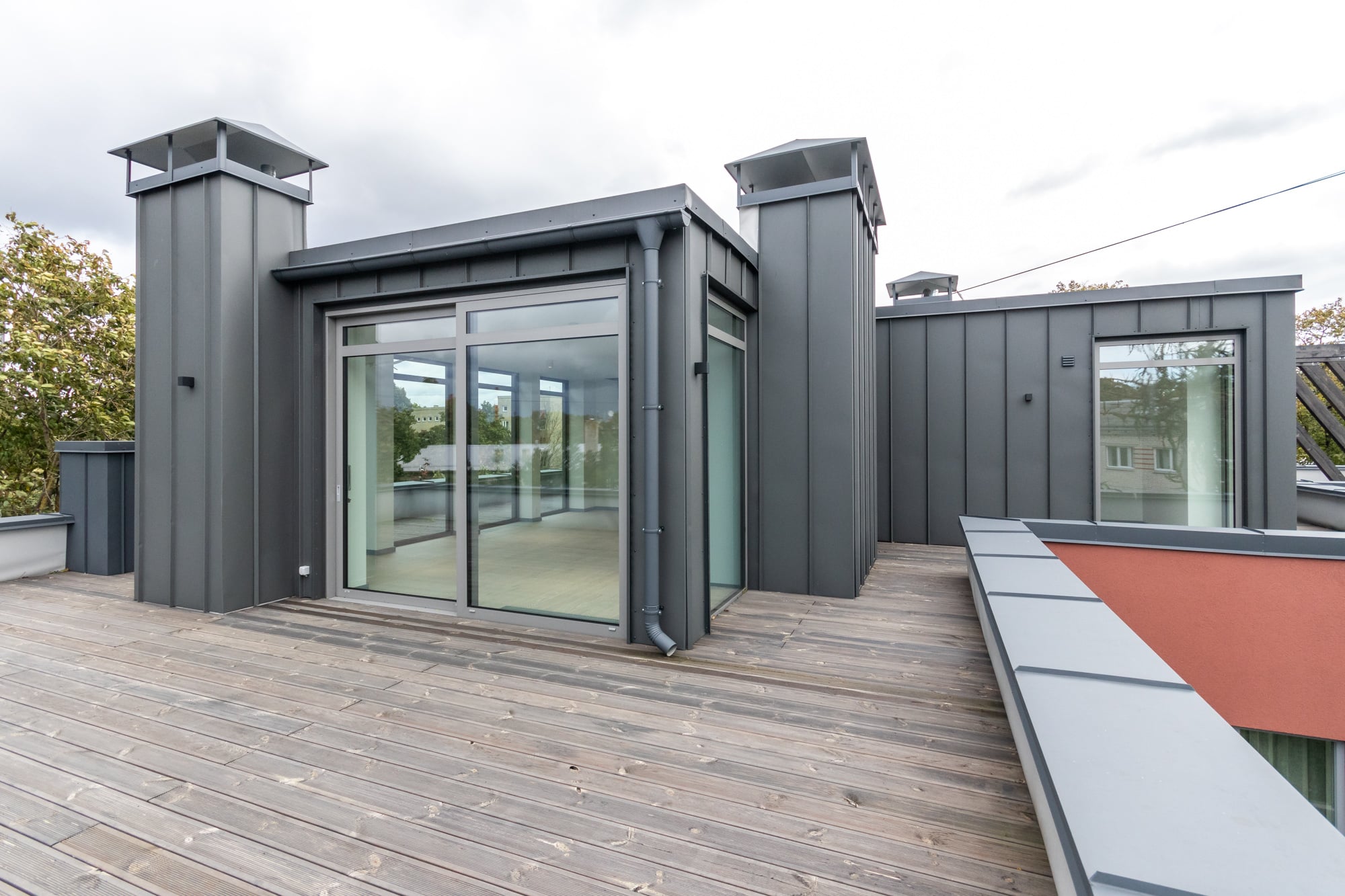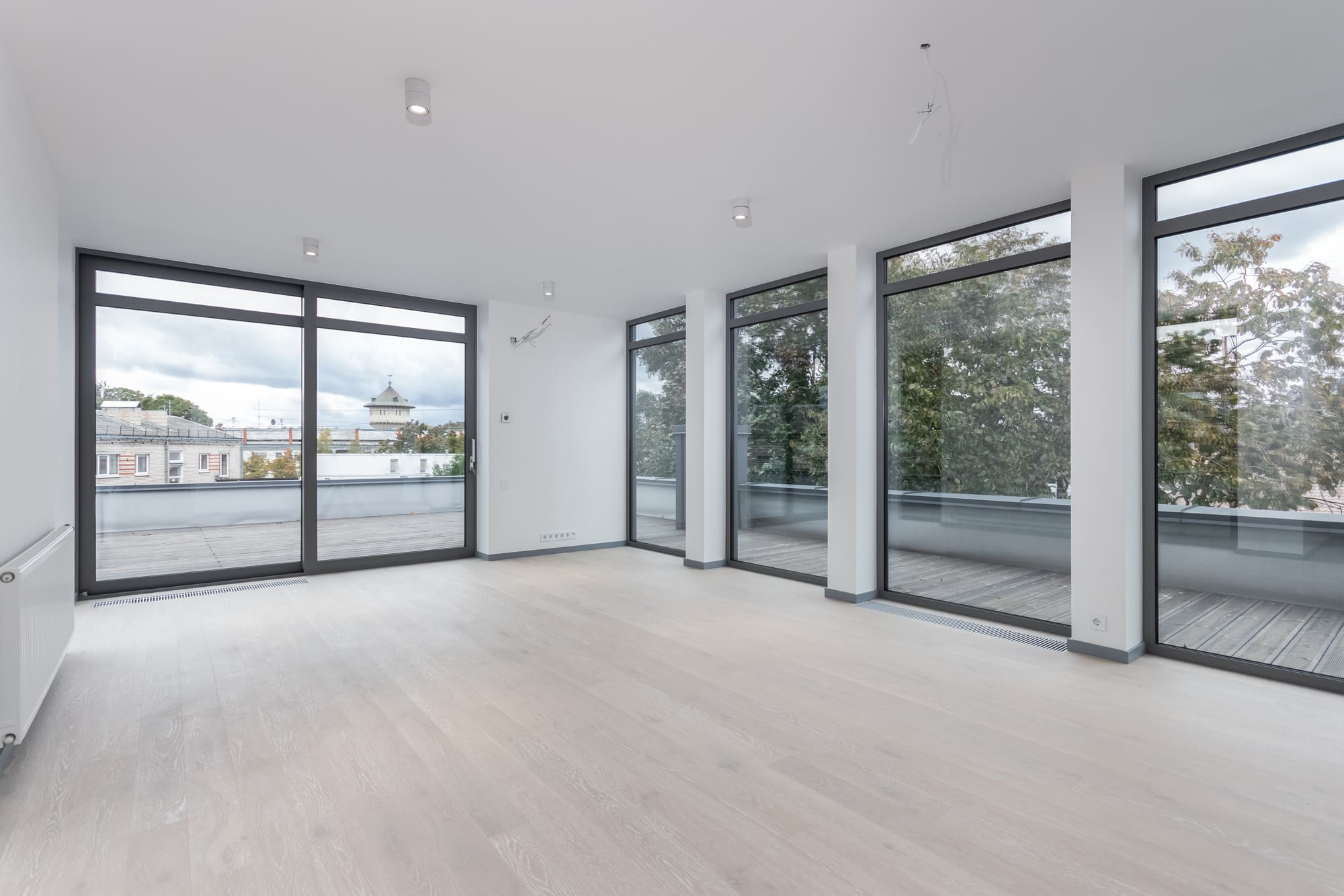 We offer for purchase a spacious and bright penthouse apartment in Agenskalns. The spacious and sunny 4-room penthouse apartment is located in the green and quiet part of Āgenskalns, it has an excellent roof terrace and beautiful views of the roofs of Āgenskalns. The apartment has a comfortable layout – an entrance hall, a spacious living room with large panoramic windows, through which light and the lovely greenery of Āgenskalns enter the premises; the living room is combined with the kitchen area, it has an exit to a wide terrace. The apartment has three bedrooms – one master – master’s bedroom, two smaller rooms, both of which have an exit to the outdoor terrace, two bathrooms, one of which is a wardrobe room, next to the master bedroom. Together with the terraces, the area of the apartment is 275.64 m2.
