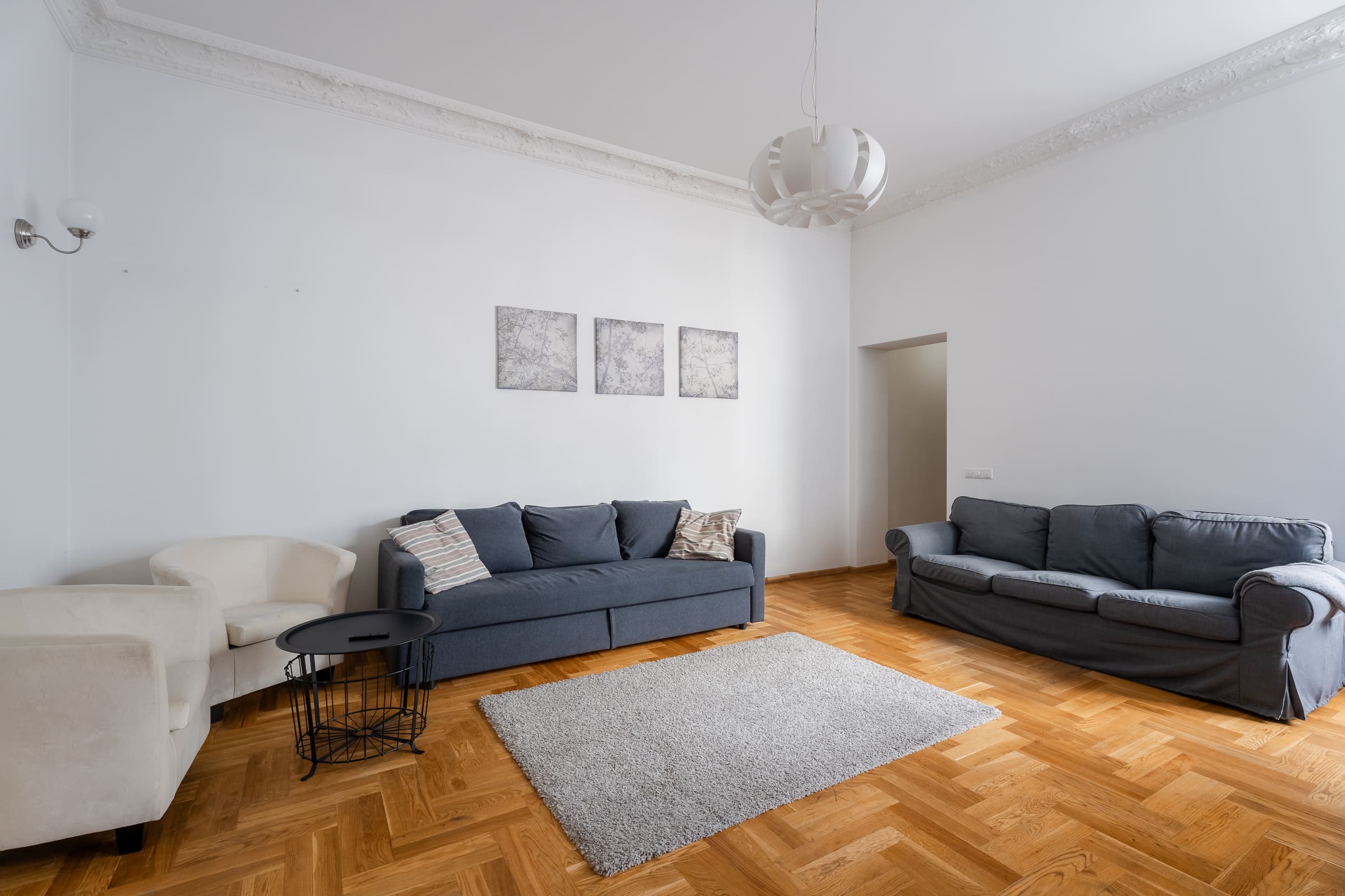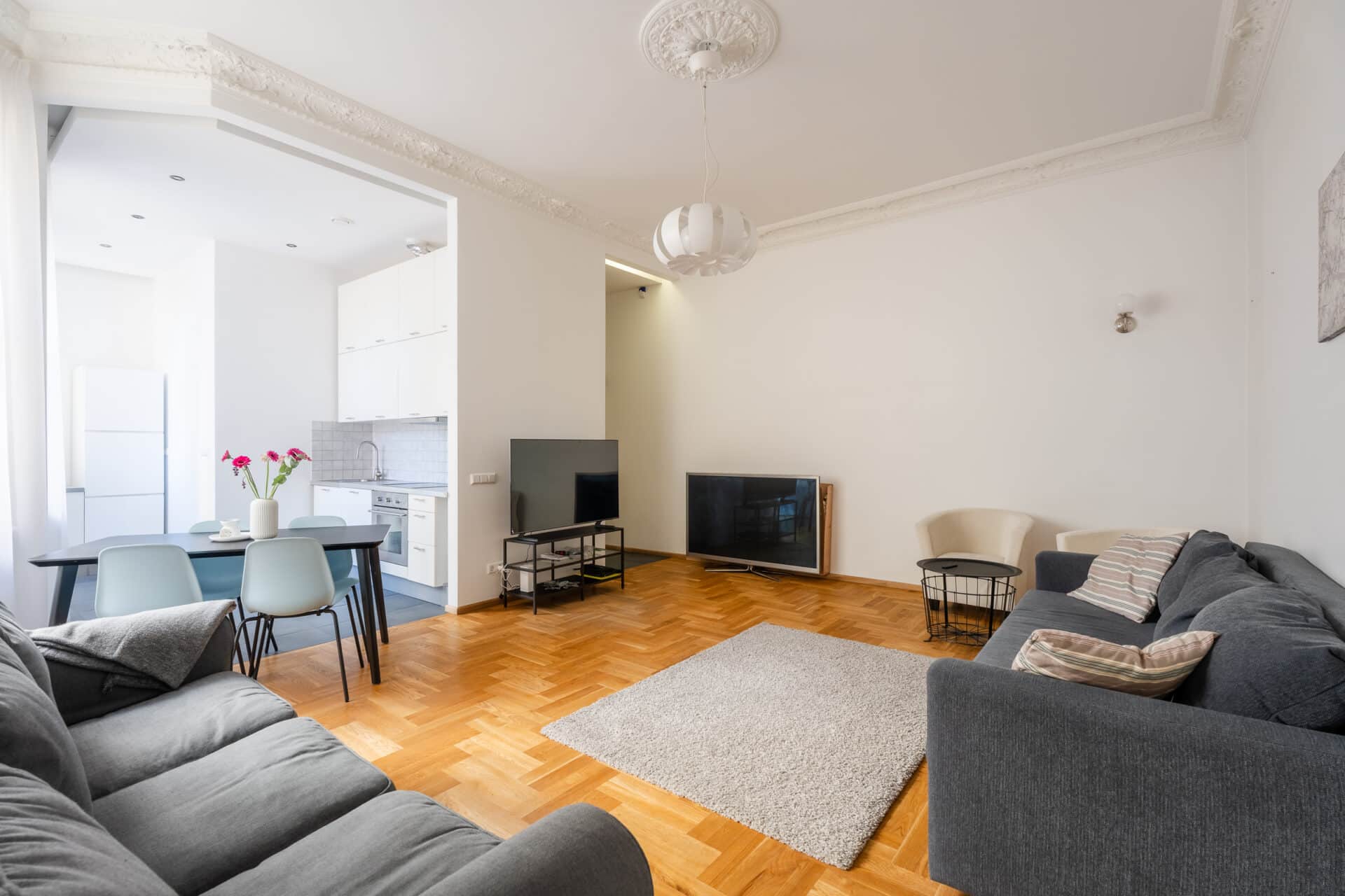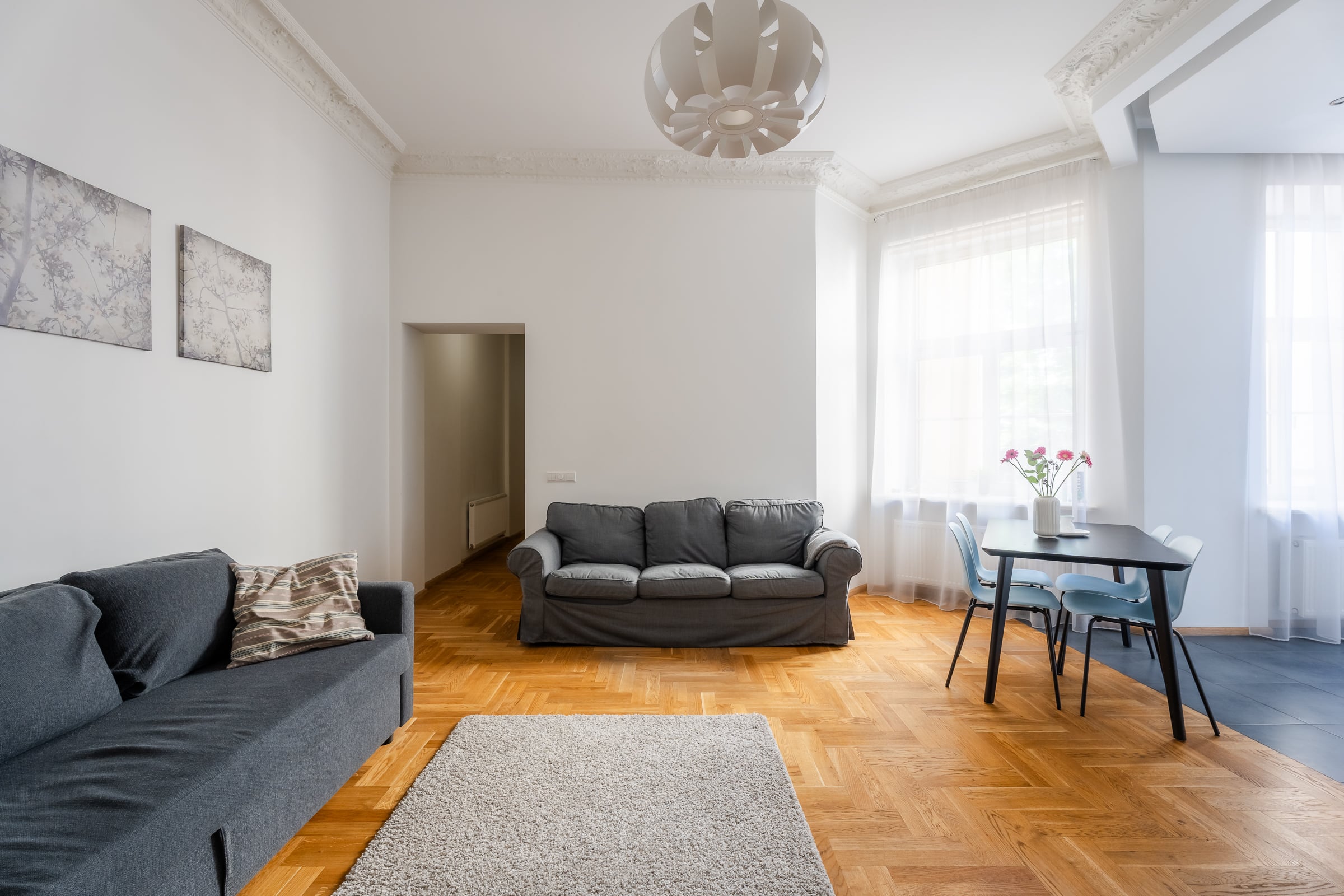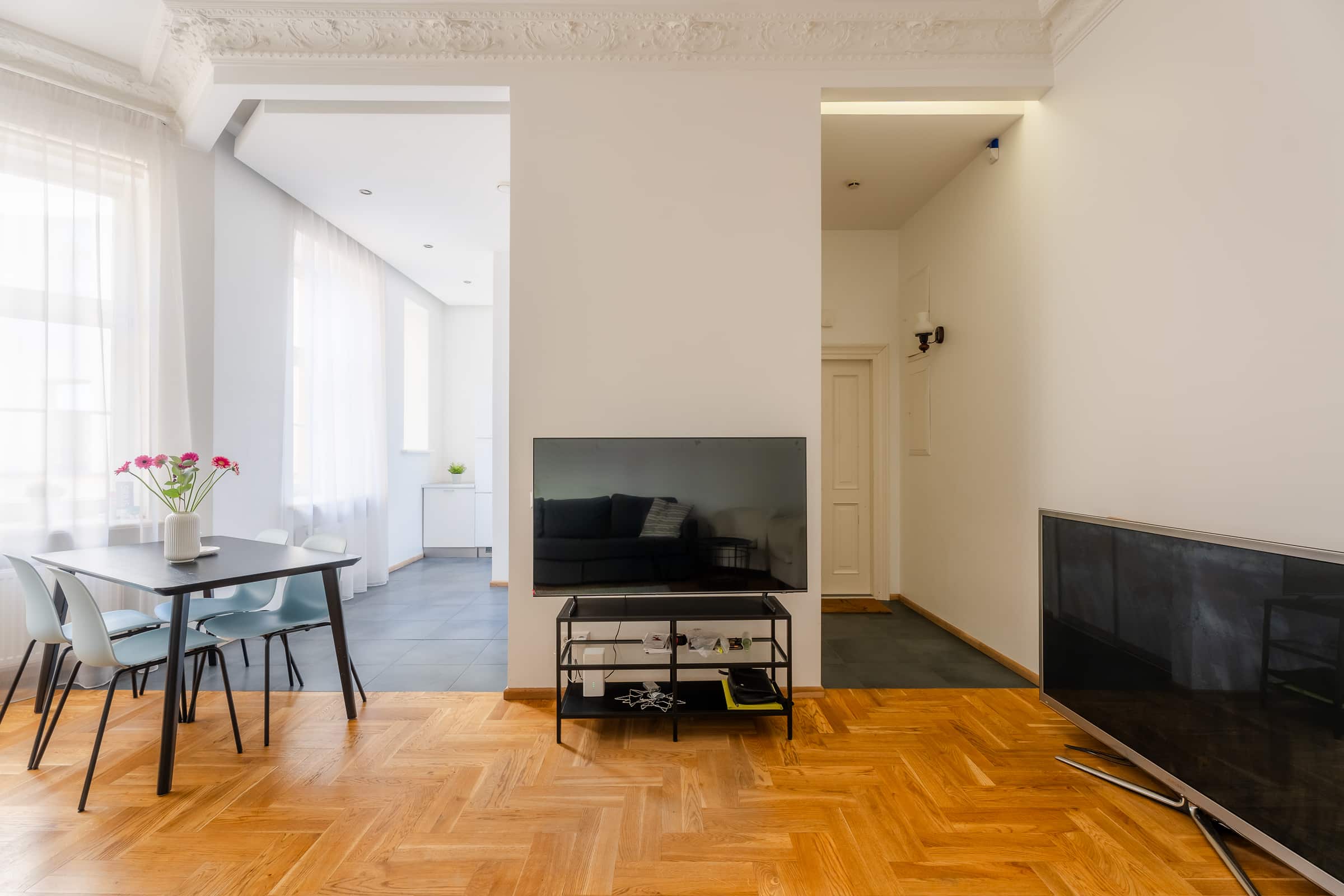 Welcome to Valdemāra Street 23, an impeccable 2-bedroom, 1-bathroom apartment nestled in a fully reconstructed building in the heart of Riga. This charming residence features a spacious walk-in closet and comes fully furnished, offering a move-in-ready experience. Enjoy the elegant living area with beautiful herringbone parquet floors and high ceilings adorned with intricate moldings. The modern kitchen, complete with sleek cabinetry and high-end appliances, flows seamlessly into the dining area. The bathroom boasts contemporary fixtures and a spacious walk-in shower. The building seamlessly blends modern comforts with historical elegance, making it a unique find in the city.